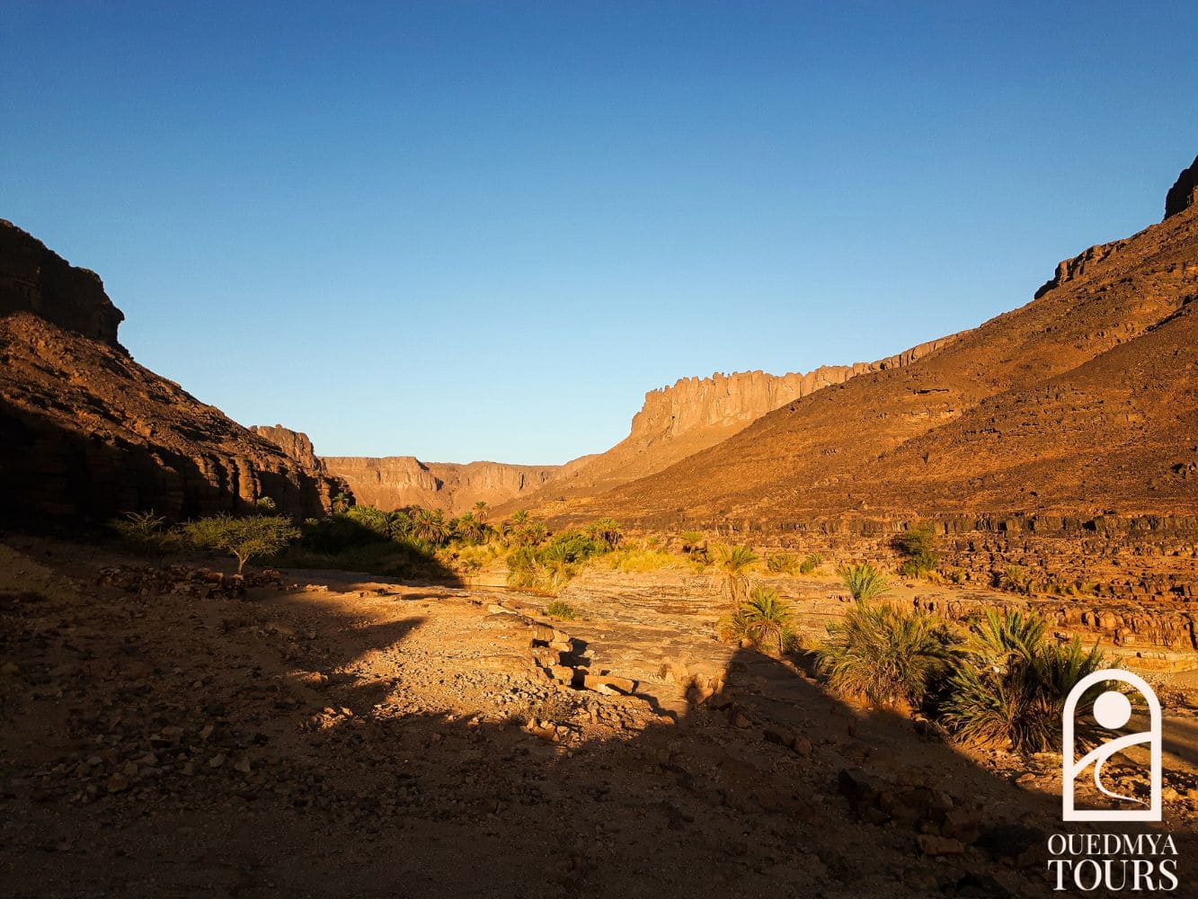 Arrivée à l'aéroport de Djanet et transfert immédiat, en 4x4, à Tégharghart. Bivouac à proximité de la célèbre gravure rupestre néolithique "la vache qui pleure". Nous quittons Tégharghart, direction Tilalléne. De Tilalléne, nous mettons plein le cap sur Essendilène: un beau canyon au fond duquel se niche la guelta aux lauriers roses. Bivouac. Nous continuons notre escapade, en allant à Dider où nous attendent les belles gravures rupestres de Tin-Taghert. De Dider, nous descendons vers l'enchanteresse oasis d'Iherir. Au rendez vous: zribas typiquement africaines,et gueltas poissonneuses. D'Iherir, nous effectuons le déplacement vers Ouagheghan: la belle vallée aux tamaris. Retour sur Djanet. Emplettes, Hammam et transfert, après le dîner, à l'aéroport Tiska.